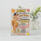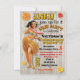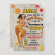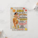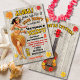 Super lustige Hawaiian Luau Birthdayparty Einladungen mit einem Vintagen Hula Mädchen und Hibiskus Blume vor einem verwitterten Holzhintergrund. Im hinteren Teil befindet sich eine Ukulele aus Holz.