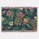 Hawaiianische tropische farbenfrohe nahtlose Muster mit Tribal-Ki-Maske Hibiskus-Blume monstera und Palm-Blätter Vintage Illustration Hawaiianische tropische Muster Umarmungen Ti Masken und Hibiskus-Blume in einem bunten Vintagen Tanz. Sagen Sie aloha zu diesem hawaiianischen nahtlosen Muster, gefüllt mit tiki Masken und tropischer Flora - ein Vintages Paradies! Tiki, Muster, nahtlos, hawaii, hawaiianisch, Blume, Aloha, Stamm, tropisch, Hibiskus, Hintergrund, Vintag, Palm, Flora, Zeichen, Illustration, Blätter, farbig, Dekoration