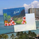 Aloha Postcard mit hawaiianischer Landschaft, Ananas und rosa Plumeria Blume. Auch Frangipani genannt, schmücken die wunderschönen rosa Blume mit orangefarbenen Zentren den Boden der Postkarte, wo zwei Ananas das Design vervollständigen. Das Hintergrundbild ist ein Berg, oder ein Vulkan mit blauem Wasser dahinter. "Aloha"-Text ist verstellt und eine Vorlage, die Sie nach Belieben ändern oder löschen können. Der Rücken ist leer mit einem Ananas Muster Hintergrund.