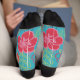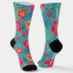 Farbenfrohe Hibiskus-Blume in Rosa und Orange mit grünen Blätter, hawaiisch inspirierte Muster auf einem blauen Hintergrund.