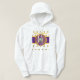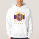 Hoodie weiß mit lila, goldfarbenen und weißen konzentrischen Kreisen über einem lila und goldenen Rechteck mit "HOLLYWOOD, CALIFORNIA CENTER OF THE UNIIVERSE" mit Y-NOT-ME Logos im Hintergrund. Dieses Design ist ein Ausruf nach Hollywood, Kalifornien, der Hauptstadt des Films der Welt.