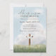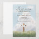 This Christian Easter brunch invitation showcases a peaceful sky backdrop with a cross illustration and the message “He Is Risen.”