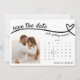 Niedliche Hochzeit speichern Sie die Datumskarte mit Foto, Herzlinie und Kalender. Personalisieren Sie es mit einem Foto von Braut und Bräutigam und ihren Namen. Verwenden Sie den Editor, um das Herz zu Ihrem Hochzeitstag zu verschieben.