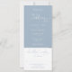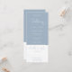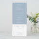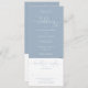 Eine ganzheitliche Hochzeitseinladung mit eleganter Herzskripttypografie auf staubblauem Hintergrund. Die Einladung enthält eine RSVP-Karte, die abgeschnitten werden kann, und Informationen zu den Gästen. Entwickelt von Thisisnotme©