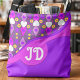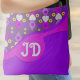 This shoulder bag covered in white hearts, yellow daisy flowers, pink diamonds all on a soft purple gray background. The bottom half pops with bold purple and magenta, and the circular monogram area lets you customize the initials to make it totally yours. It’s perfect for school, errands, or weekend adventures. The strap is adjustable and black for a sleek contrast.