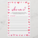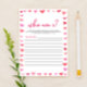 This is a Red Pink Hearts Who Am I? Bridal Shower Game.
