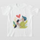 Ein fröhliches und liebevolles T - Shirt-Design mit einem Jungen in einem grünen Shirt und einer blauen Baseballkappe, die seinen Schwarz-Weiß-Hund mit einem roten Kragen umarmt. Ein großes rotes Herz schwebt über ihnen und symbolisiert ihre starke Bindung. Set vor einem weichen Lavendelhintergrund mit spielerischen Blätter, Punkten und funkelnden Sternen, dieses herzerwärmende Design ist perfekt für Jungen, die Hunde Liebe und niedliche, liebevolle Kunstwerke.