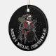 Dieser böse Weihnachtsschmuck verfügt über einen Skelettssanta, der hinter einem Drum-Kit sitzt, Schlagzeug in Hand, mit der Beschriftung "MERRY METAL CHRISTMAS". Die perfekte Feriendekoration für Rocker, Metallköpfe, Musiker und Musikfans. Sie können festlich UND Metall sein! Besuchen Sie unbedingt meinen Shop auf zazzle.com/drumjunkiegraphics für mehr Musik Merch und Musiker Geschenkideen!