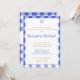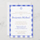 Eine hebräische Zeremonie für Junge Einladung zu einem Brit Shalom. Die Vorlage hat ein blaues homespun rustikales Gingham Thema. Die Designvorlage ist blau mit Text, der leicht auf Ihre Informationen geändert werden kann. Wählen Sie aus einer Reihe von Papiertypen. Der Stern von David erscheint auf dem Design.