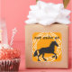 Niedliche schwarze Silhouette eines Pferdes auf einem senfgelben Hintergrund und in einem Vintagen Kreis umkreist. Die Worte "Yom Huledet Sameach" (Happy Birthday in Hebräisch) passen zur schwarzen Silohuette.