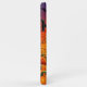 Ein fröhlicher Hund mit einem großen orangefarbenen Hexenhut trägt ein Halloween-Bild. Es steht vor einem strahlenden Sonnenuntergang und im Hintergrund befindet sich ein großer, runder Kürbis. Um den Hund herum gibt es einige gemeißelte Kürbis, die die festliche Atmosphäre noch verstärken.