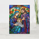 Gestaltetes Glas der heiligen Familie. Maria, Joseph und das Baby Jesus. Auf der Innenseite der Karte in rot ist der Vers Matthew 1:23, " Siehe, die Jungfrau wird mit Kind sein und einen Sohn tragen, und sie werden Seinen Namen Immanuel nennen."