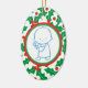 Heiliger Berry Baby's 1. Weihnachtsschmuck mit einem bezaubernden Baby in einem grünen, roten und heiligen Beerenrahmen gemustert an der Vorderseite, während auf der Rückseite der Name des Babys steht.