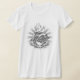 der T - Shirt V-Hals Frauen mit Tätowierungsentwurf. Übergeben Sie gezeichnetes heiliges Herz mit Rosen, Flamme und Ausstrahlenlicht. Die folgende Aufschrift liest "Cineri Gloria Seren Venit" (Ruhm kommt zu den Toten zu spät).