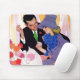 Künstler: Frau Joes DeMers | in einem lila Kleider- und des Hutestrinkenden Kaffee an einem Tisch mit einem Mann, der eine Zigarette raucht