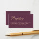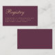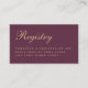 Eine einfache Hochzeitszimmerkarte: Nur goldener Text auf dem Hintergrund der Weinfarbe. Der Titel Registry ist in einem eleganten kalligrafischen Skript geschrieben. Der Text ist verlassen ausgerichtet.