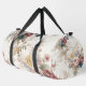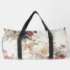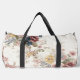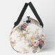 This image showcases a duffel bag adorned with a beautifully faded and intricate floral print, evoking the charm of heirloom chintz or a vintage garden tapestry. The design features a delicate array of blossoms in muted tones of dusty pink, soft yellow, faded blue, and subtle burgundy, intertwined with leafy branches, all set against a textured, antique white background. The overall aesthetic is one of timeless elegance and gentle nostalgia. Equipped with sturdy, dark-colored straps and a secure zipper closure, this bag is a functional yet exquisitely designed accessory, perfect for travel, gym use, or adding a sophisticated, old-world touch to any ensemble.