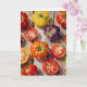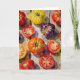 An arrangement of colorful tomatoes lies on a rustic wooden surface. The mix of whole and sliced tomatoes highlights their varied hues and textures.