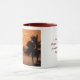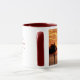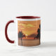 weiße Tasse mit roter Kante und Griff, Bild des roten, orange, gelben Tropensonnenuntergangs mit Palmen und des Textes liest: "Ich habe nicht Hitzewallungen. Ich habe kurze private Ferien in den Tropen."