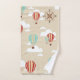 Themenorientierte Badtücher des entzückenden Heißluftballonreisenden. Sie kennzeichnen die roten und blauen Heißluftballone, niedliche punktierte Linie weiße flaumige Wolken, beige Hintergrund und das Betonen der Kompass-Rose auf dem Badtuch.