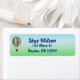 Ein Heißluftballon segelt durch den Himmel neben Ihrem Namen und Ihrer Adresse in dunkelblau.
