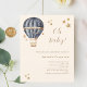 Ein blauer und goldener Heißluftballon mit goldenen Sternen. Vintage Babydusche zum Feiern eines kleinen Jungen. Text: Oh Baby! Beigefarbener Hintergrund. Personalisieren und fügen Sie einen Namen und Party-Details hinzu.