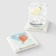 Ein bunt orangefarbener Heißluftballon, der 2 Silhouetten transportiert. Der Himmel ist eine Kombination aus wirbelnden Pinks und Blues, und der Boden unten ist von Bergen und einem Baumbestand bedeckt.