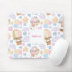 Ein Mauspad mit einem niedlichen und skurrilen Muster. Heißluftballons und niedliche Wolken mit Gesichtern zwischen Sternen und Herzen und Ballons. Weiche Pastellfarben bilden dieses bezaubernde Design. Ein weißes Quadrat, oben mit dem Text überlegt.