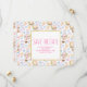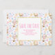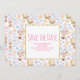 Babydusche Save the Date Karte mit einem niedlichen und skurrilen Muster. Heißluftballons und niedliche Wolken mit Gesichtern zwischen Sternen und Herzen und Ballons. Weiche Pastellfarben bilden dieses bezaubernde Design. Ein weißes Quadrat mit einem goldenen Imitat-Folienabrand, der oben mit dem Text im Inneren platziert ist.