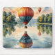 Helle Heißluftballons schweben sanft über einem ruhigen See und reflektieren lebhaft auf der Wasseroberfläche in Aquarellfarben