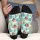 Diese gemusterten Socken zeigen meine bemalten Illustrationen von Heißluftballons und weißen Wolken gegen einen weichen blauen Himmel. Blasen in Rot, Gelb, Grün, Blau und Orange illustrieren diese Socken.