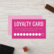 Lila Treue Punch Card in einem sehr sauberen Design für Ihr Unternehmen in heißrosa, weiß und einem leichteren Rosa. Die Treuekarte ist für zehn Besuche oder Käufe. Personalisieren Sie mit Ihrem Unternehmensnamen und Kontaktinformationen auf der Rückseite, wo der Text heißrosa auf einem schönen, helleren Rosa ist. Fügen Sie auch hinzu, was Ihr Kunde oder Ihre Kundin bei ihrem zehnten Besuch oder Kauf erhält.