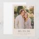 Diese Hochzeit-Save-the-Date-Karte zeigt ein warmes, intimes Foto von zwei Personen, die eng beieinander in einer weich verschwommenen Gartenszene stehen. Die Farbpalette umfasst weiche Erdtöne wie Beige und gedämpfte Grüntöne, die eine ruhige und einladende Atmosphäre schaffen. Das saubere, zentrierte Layout hebt das Datum und die Namen mit moderner serifenloser Typografie hervor und sorgt für Klarheit und Fokus auf die wichtigsten Details. Die allgemeine Stimmung ist fröhlich und romantisch und fängt einen authentischen Moment der Freude und Verbundenheit ein, perfekt, um Ihre bevorstehende Feier zu teilen.