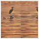 Dieses feine Kunsttiergewebe zeigt ein sich wiederholendes abstraktes Muster eines Großen Blauen Helden (Ardea herodias) in der Silhouette. Dieser anmutige Vogel fischen in den flachen Gewässern des Cayuga-Sees in Ithaca, NY, einer der Finger-Seen des upstate New York. Ein wunderschöner Sonnenuntergang in Orange, Gelb und Gold färbt die Wellen und Wellen.
