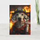 Ein tapferer Dalmatiner, der als Feuerwehrmann verkleidet ist und vor einer brennenden Szene mit Funken stehend ist. Der Hund trägt einen Feuerhelm und Schutzausrüstung, die Mut und Heldentum symbolisieren.