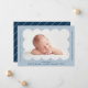 Einfache und moderne Geburtsankündigung mit dem Foto Ihres Babys in einem hellblauen Skallopierrahmen. Personalisieren Sie die hellblaue Geburtsankündigung, indem Sie den Namen Ihres Babys und zusätzliche Informationen in der Marine-Schrift hinzufügen. Auf der Rückseite der Karte befindet sich ein minimaler Streifen in marineblau und hellblau.