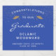 Feiern Sie den Meilenstein Ihres Absolventen stilvoll mit diesen individuellen Abschluss-Schaumweinflaschen-Etiketten, die mit den Worten "Herzlichen Glückwunsch an unseren Absolventen" in weißem Text auf einem hellblauen Hintergrund. Das Wort "Graduate" erscheint in einem anmutigen Skript im Handschriftenstil. Ein paar goldene Imitate Glitzer Mörtel-Kappen und eine Streuung von Goldkonfetti schmücken den oberen Teil des Etiketts. Personalisieren Sie es mit dem Namen, der Schule und dem Jahr des Abschlusses.