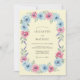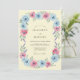 Dieses Design zeigt eine weiche Aquarellpalette aus hellblauen und rosa Rosen, die auf einem cremig gelben Hintergrund schön angeordnet sind. Zarte Zweige von lila Lavendel und salbeigrünem Laubwerk verleihen eine naturinspirierte Eleganz. Der malerische Stil schafft eine romantische und luftige Atmosphäre, die perfekt für eine saisonale Frühlingshochzeit ist.
