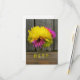 Eine Hochzeitsfeier mit einem Foto vor einem Glas mit hellrosa und grünen Gängen, überragt von einer gelben Dahlia. Hintergrund ist Barnwood. Personalisieren Sie den Text vorne und hinten.