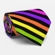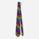 Die Krawatte ist mit schwarzen, gelben, orangefarbenen, grünen, blauen, heißen rosa und lila Streifen in lebhaften Farben gehalten.