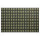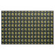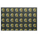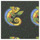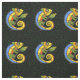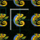 Dieser Sonderstoff am Hof hat ein wiederholtes Bild einer hellen, abstrakten Eidechse in Grün, Gelb, Orange und Blau mit großen runden Augen, die einen Zweig mit einem Blatt auf einem schwarzen Hintergrund mit grünen Polka-Punkten halten.
