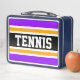 Dieses sportliche Design zeichnet sich durch feinen TENNIS-Text in einem breiten, schwarzen, horizontalen Rennstreifen im Zentrum aus, hervorgehoben mit schwebenden weißen und goldgelben Pinstreifen gegen lila äußere Streifen. Der Text kann personalisiert sein.