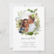 Elegante botanische speichern Sie die Daten verfügen über ein beliebtes Foto der Verlobung, umgeben von einem runden Kranz von Eichen und Blätter in einer eleganten Aquarellpalette von Grauen und Grün mit massiven blauen Blumen. Personalisieren Sie mit Ihren Namen, Hochzeitsdatum und Ort.