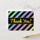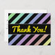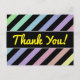 Dieses PostkartenAusrüstungsbeschreibungen ein Muster der Streifen färbten verschiedene helle Pastellfarben, mit schwarzen Streifen zwischen ihnen. Es kennzeichnet auch die Mitteilung "dankt Ihnen!" auf der Front im gelben Skript ähnlichen Text, zusammen mit einer personalisierten Mitteilung von Dankbarkeit auf der Rückseite.