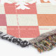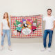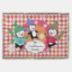 Die schöne Weihnachtsdecke mit drei zauberhaften Pinguinen in Eis, Pullover, gestreiften Schals und Winterhütten auf weißer, roter, orangefarbener und rosafarbener Raute, einem rosa Bereich mit weißen Schneeflocken und einer tiefen Orange mit weißen Polka-Punkten-Zentrum. Sie können ganz einfach mit Ihrem Familiennamen personalisieren!
