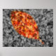 Ein selektiv gefärbtes Herbstfoto aus gefallenen crepe Myrte-Blätter mit einer goldgerahmten Blattform aus hellrot, orange und gelb vor schwarz-weißem Hintergrund.