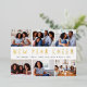 Teilen Sie sechs beliebte Fotos mit unserer hellen und festlichen Urlaubskarte oder der New Years Card. "Neujahrskaue" erscheint in der Mitte in Goldfolie als Ausschnitt mit Ihren Namen und dem Jahr darunter.