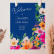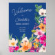 Begrüßen Sie Ihre Gäste stilvoll mit unserer eleganten, hellen und kühnen, modernen Sommer-Blume-Illustration mit hübscher, überdimensionierter WildBlume und Brautparty-Pinsel-Schrift mit einer modernen Kalligraphie-Typografie mit leuchtendem Neonrot, Orange, Grün und Gelb auf blau