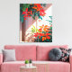 Eine lebendige und ruhige botanische Illustration mit üppigen tropischen Pflanze und rot-orangefarbenen Blätter, die in warmer Sonne baden. Die sanften Schatten und der moderne Eingangsbereich schaffen eine ruhige und sommerliche Atmosphäre. Ideal für Naturliebhaber, die ein minimales tropisches Design und eine gemütliche Wohngestaltung lieben.