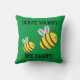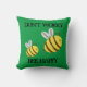 Mach dir keine Sorgen. Sei glücklich! Dieser Pun ist in einer Hauptstadt geschrieben, die in einem hellen, grünen Kissen mit quadratischer Spitze liegt und mit zwei Cartoon, sehr niedlich, Bienen, geschmückt ist. Die Bienen sind hauptsächlich hellgelb und der Text schwarz. Das Design ist auf beiden Seiten des Kissen / Kissen.